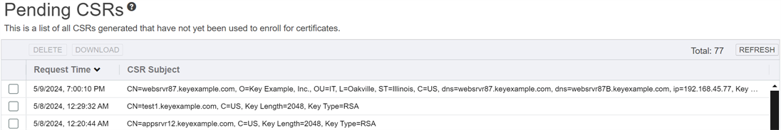 The Pending CSRs page allows you to see if you have any outstanding certificate signing requests that have been generated but not married with an issued certificate. From here, you can download them so that you can use them for enrollmentClosed Certificate enrollment refers to the process by which a user requests a digital certificate. The user must submit the request to a certificate authority (CA). or delete them if they are no longer needed. To download, highlight the selected row, right-click and choose Download from the right-click menu, or choose the Download action button at the top of the grid.