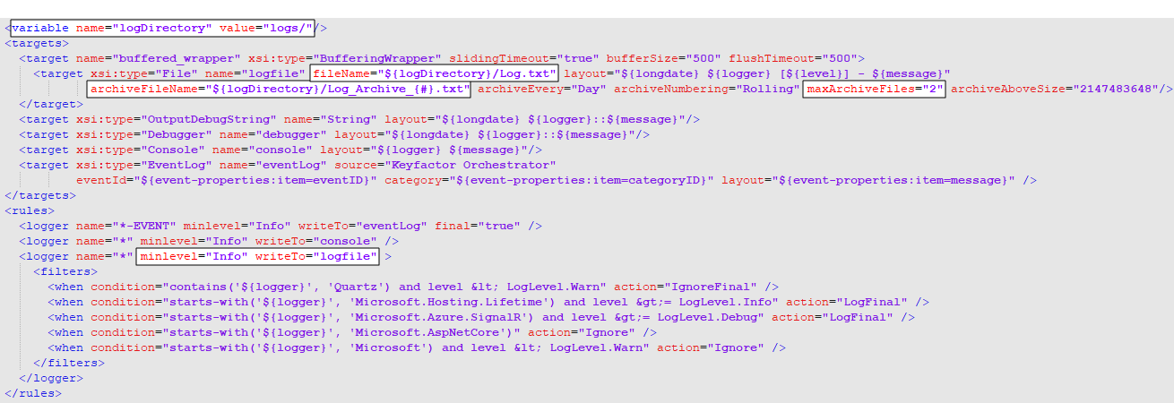 By default, the Keyfactor Universal OrchestratorClosed Keyfactor orchestrators perform a variety of functions, including managing certificate stores and SSH key stores. generates logs at the INFO logging level and stores logs for two days before deleting them. If you wish to change these defaults, follow the directions below for your installation type.