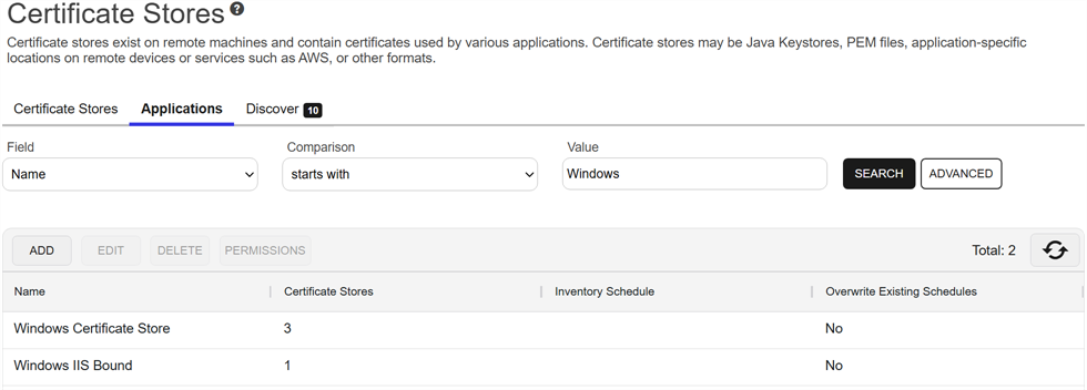 Locations → Certificate Stores → Applications Tab