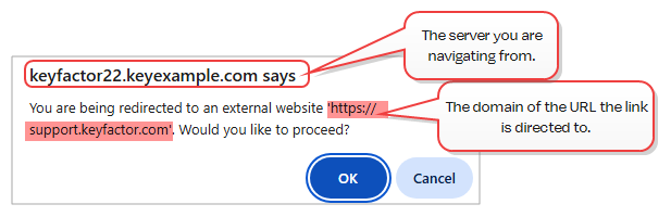 If a script on the page in the Management Portal attempts a full-page redirect, or if a link inside the application is clicked that navigates to another domain, the user will receive a warning they will need to acknowledge to proceed. For visibility, the warning will display the domain the link is directed to. The message will be similar to this: