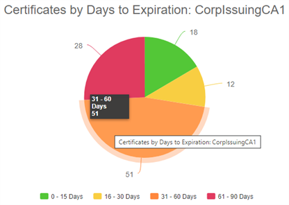 A certificate authority (CA) is an entity that issues digital certificates. Within Keyfactor Command, a CA may be a Microsoft CA or a Keyfactor gateway to a cloud-based or remote CA. or CAs. Data for certificates approaching expiration is presented in a pie chart broken out into certificates that will expire in the next 15 days, in 16-30 days, 31-60 days and 61-90 days. Data for certificates that have been recently created or renewed is presented in a bar chart that includes data for the current month and the previous month, broken out by month and renewed versus newly created. In addition, a summary pie chart is included that shows all the active certificates for the selected CAs broken out by CA.