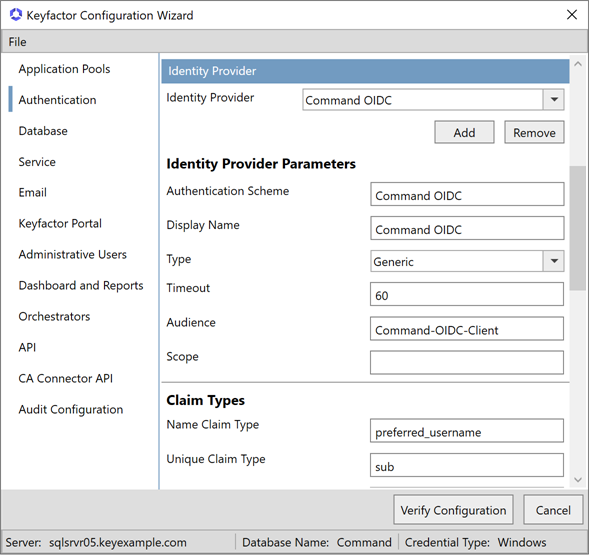For Keyfactor Identity Provider, the Authentication Scheme you enter here must match the name you used when configuring the redirect URLs for Keyfactor Identity Provider (see Configuring Keyfactor Identity Provider and Collecting Data for the Keyfactor Command Installation).