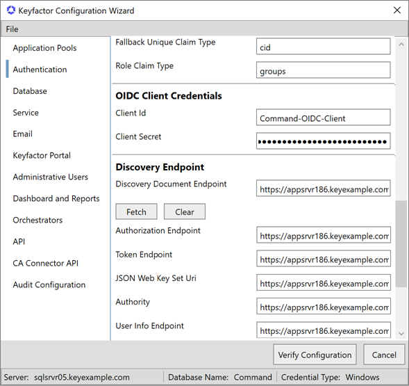 - At the bottom of the Keyfactor Command Configuration Wizard dialog, click Verify Configuration.