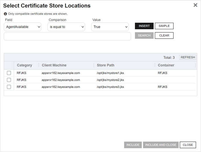 Note: Only compatible certificate stores and only stores in containers to which you have permissions are shown on the grid.Tip: You may change the search results by using the search fields at the top of the dialog. All of the Keyfactor Command grid search features are available to assist your search. See Using the Certificate Store Search Feature for more information on the available search fields. The default search criteria is AgentAvailable is equal to True.The actions on the Select Certificate Store Locations dialog are: