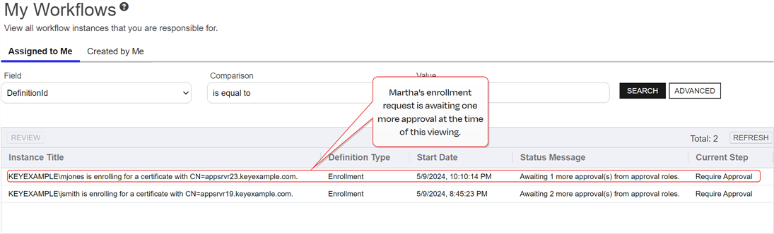 The new workflow instance appears on the Assigned to Me tab of all users with the Enrollment Approvers role and on Martha's Created by Me tab. Approvers Mary and John approve the instance on their respective Assigned to Me tab and the certificate is issued. The workflow instance disappears from the Assigned to Me tab for all users. It's still visible on the main Workflow Instances page and on Martha's Created by Me tab as a completed instance.