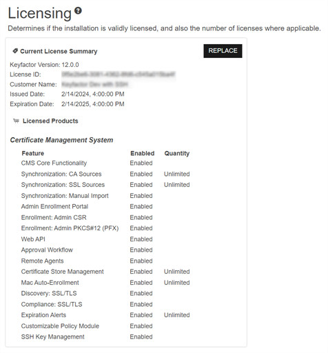 > Licensing. The license shows you the features that are enabled for your Keyfactor Command implementation.