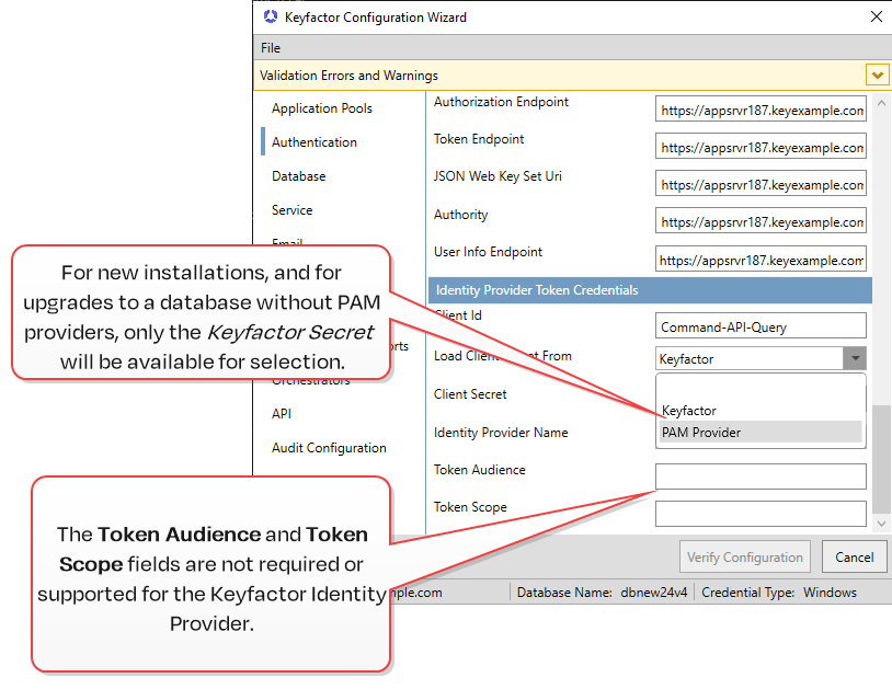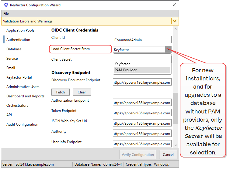 Select the source from which to load client secret credentials you will use for this configuration. Note: For new installations and upgrading databases with no PAM providers, only Keyfactor will be offered. If a PAM provider has been added to the database (such as when upgrading and existing database), the dropdown option of PAM Provider will be offered.