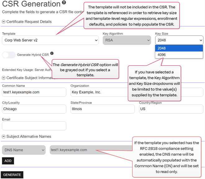 A regular expression--RegEx--is a pattern used to validate data by ensuring it meets specific criteria. Several fields on the CSR enrollment, CSR generation, and PFX enrollment pages support RegEx validation, including certificate subject and metadata fields. is applied.If you choose to select a template during CSR generation, you will need to choose the same template during CSR Enrollment, because the CSR file will contain elements from the template which may conflict with other template configurations.