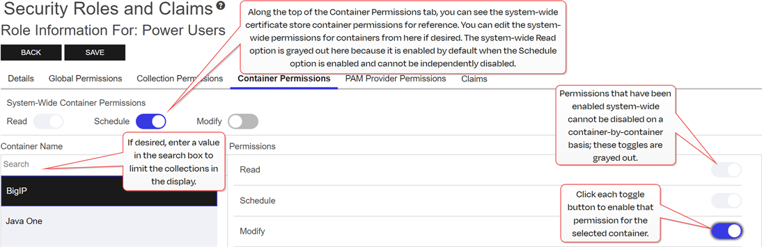 Container-by-container permissions are set on the Container Permissions tab of the Role Information dialog for each container by name using the same set of permissions.