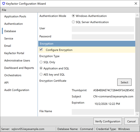 The Configure Encryption option allows you to encrypt select sensitive data stored in the Keyfactor Command database using a separate encryption methodology utilizing a Keyfactor Command-defined certificate on top of the SQL server encryption noted above. This additional layer of encryption protects the data in cases where the SQL Server master keys cannot be adequately protected.