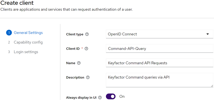 In the Keyfactor Identity Provider Administration Console, browse to Clients. Click Create client to add a service account. On the General Settings tab, select a Client type of OpenIdConnect and enter a unique Client ID. This Client ID will be how you will reference the service account from Keyfactor Command. It should not contain spaces. Give the client a Name and Description. Toggle the Always display in UI option to On to allow the account to always appear in the UI even when it’s not in active use. Click Next.