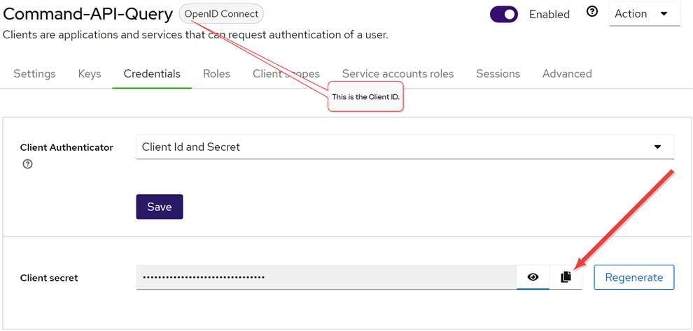 In the Client details on the Credentials tab, click the Copy button next to the Client secret field to copy the unmasked version of the client secret to the clipboard (you do not need to display it unmasked first) and save this in a secure location. For the service account Keyfactor Command uses to make API requests, you will need this and the Client ID during the Keyfactor Command configuration.