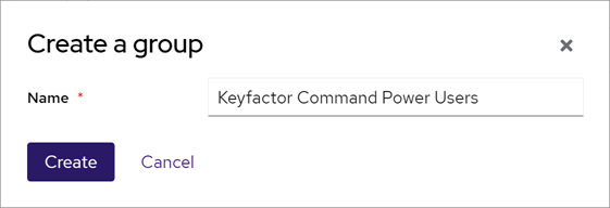 If desired, you can organize your roles into groups. This can simplify the process of assigning the roles to your users. To create a group, in the Keyfactor Identity Provider Administration Console, browse to Groups. Click Create group to add a new organizational group. Enter a Name for the group.
