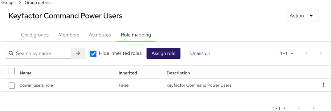 Tip: Roles assigned via group membership won’t appear on the Role mapping tab unless you uncheck the Hide inherited roles checkbox.Figure 668: Assign a Role to a Keyfactor Identity Provider User