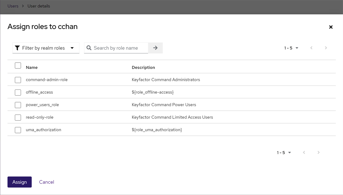 If you prefer to add roles directly rather than via groups, in the user details on the Role mapping tab, click Assign role and select a role for the new user.