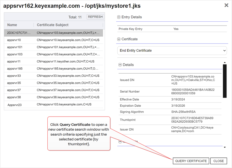 The Query Certificate Store option allows you to open a new browser tab with an instance of the Management Portal open to the certificate search page pre-populated with search criteria to locate the certificates found in that certificate store.