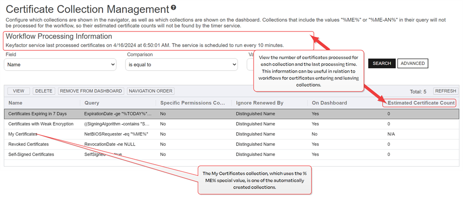 - Search for specific certificate collections from the list (see Using the Collection Management Search Feature).