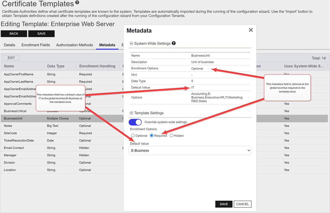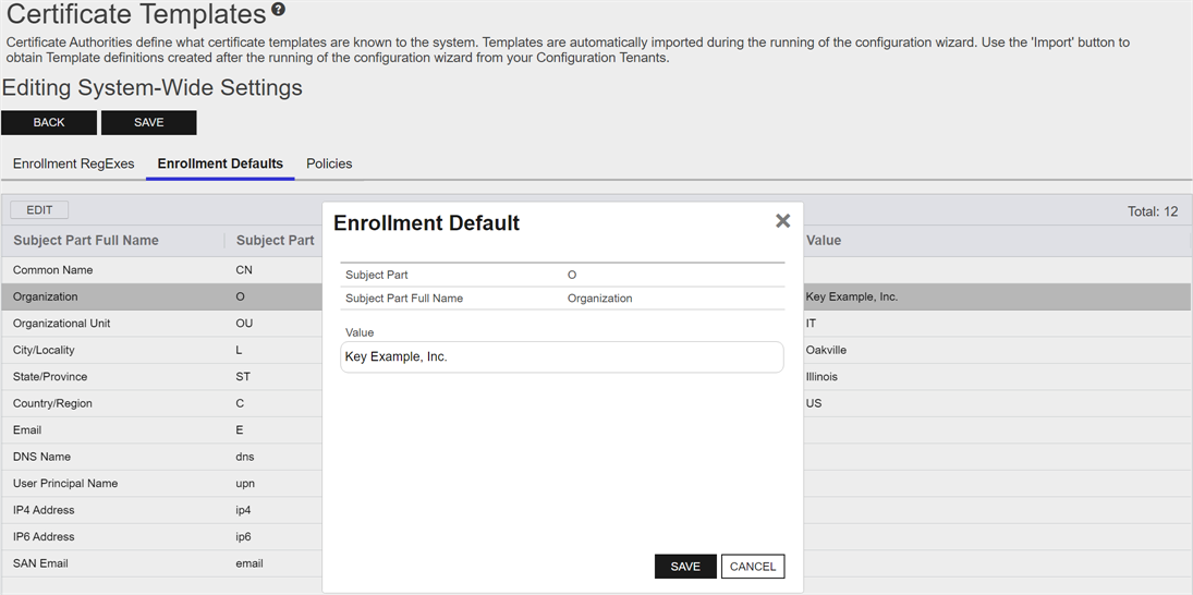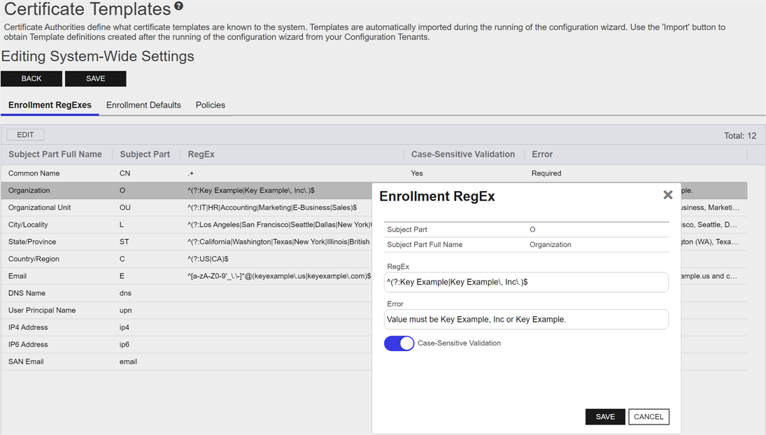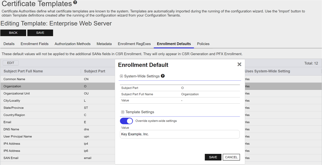 The global settings option allows you to configure regular expressions, certificate subject defaults and policies that apply to all enrollments unless overridden by template-level settings.