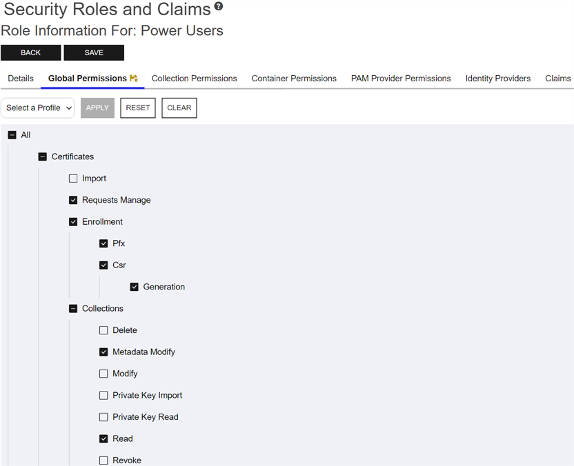 Note: Selecting a permission set limits the permissions available for selection in the dialog to those supported by the permission set. If you select a permission set other than the Global permission set, some permissions may not appear in the dialogs. This includes the CollectionThe certificate search function allows you to query the Keyfactor Command database for certificates from any available source based on any criteria of the certificates and save the results as a collection that will be availble in other places in the Management Portal (e.g. expiration alerts and certain reports). Permissions, Container Permissions and PAM Provider Permissions tabs, which only appear if the permissions for these are included in the selected permission set.