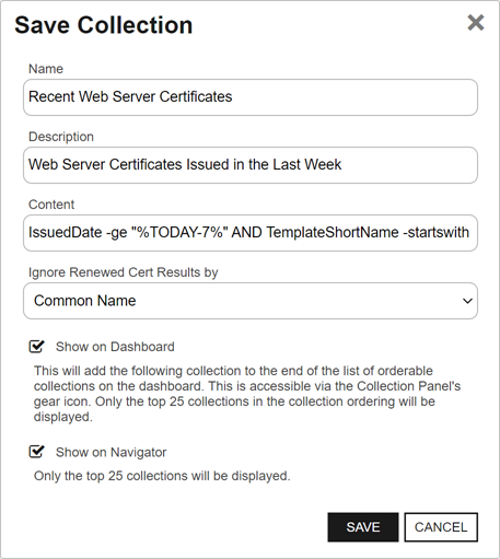 5. Check the Show on Dashboard box to include the results from this collection on the Collection dashboard (see Dashboard: Collections). To change this setting later, see Certificate Collection Management.