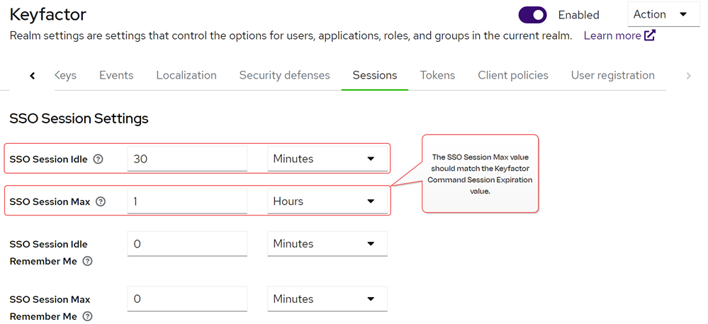 7. In the Keyfactor Identity Provider Administration Console, browse to Realm settings and select the Sessions tab.