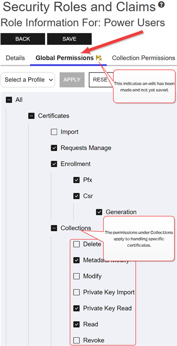 Permissions on certificates and their collections can be controlled at two levels—system-wide at the certificates-collections level and on a collection