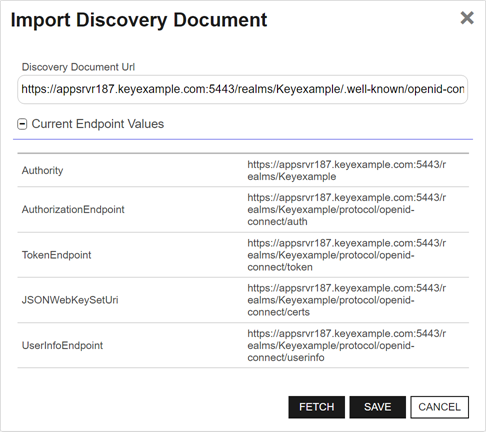 Click Import Discovery Document to enter the discovery URL for the identity provider and automatically populate the Authority, AuthorizationEndpoint, TokenEndpoint, JSONWebKeySetUri, and UserInfoEndpoint fields. Click Fetch to retrieve the information and Save to save it to the identity provider form.