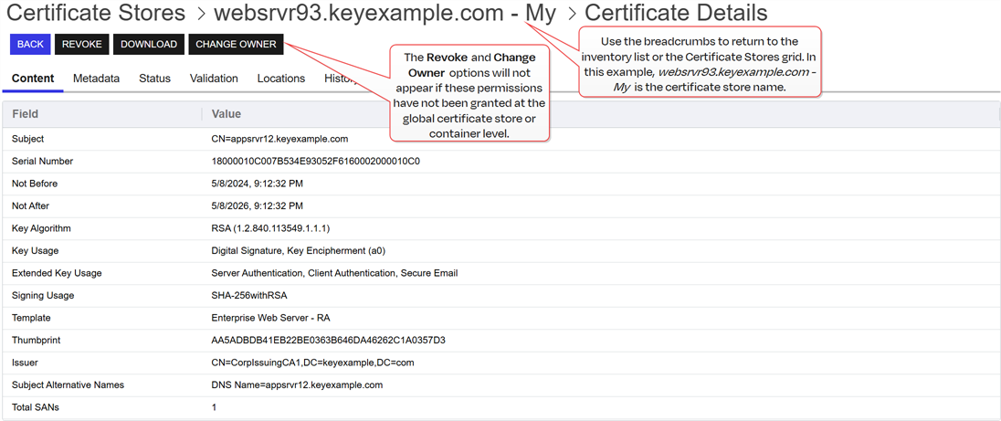 Depending on the permissions granted globally to certificate stores or the container associated with the selected certificate store, one or more of the following options may be available on the certificate details page: