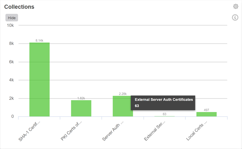 If you opt to include any certificate collections for display on the dashboard (see Certificate Collection Management), you will see the data on the Collections dashboard panel. This panel shows a bar representing the total number of active, expired and revoked certificates for each certificate collection configured for dashboard display. Hover over a bar to see the number of certificates in the collection. Click on a bar to open the certificate search page in a new window filtered for that certificate collection.