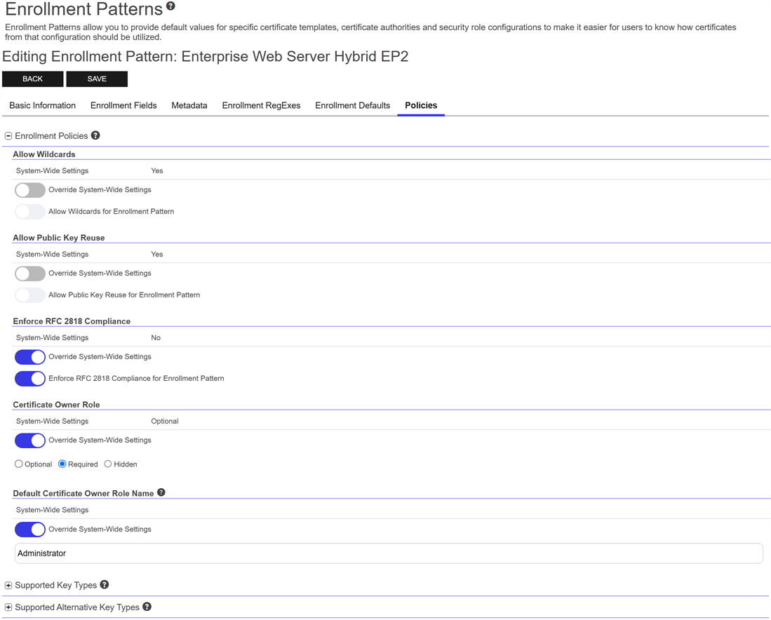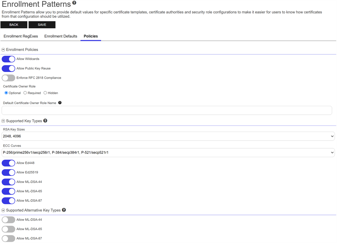 EnrollmentClosed Certificate enrollment refers to the process by which a user requests a digital certificate. The user must submit the request to a certificate authority (CA). patterns in Keyfactor Command provide a flexible way to streamline certificate enrollment by defining default values, policies, and access configurations for specific certificate templates and certificate authorities. This functionality helps reduce duplication of templates at the CAClosed A certificate authority (CA) is an entity that issues digital certificates. Within Keyfactor Command, a CA may be a Microsoft CA or a Keyfactor gateway to a cloud-based or remote CA. level while meeting diverse business requirements. On this page, you can manage enrollment patterns by adding, editing, and deleting them, configuring system-wide settings, and copying existing patterns to create new ones. These operations ensure enrollment processes are tailored to user groups, enforce security policies, and simplify certificate management.