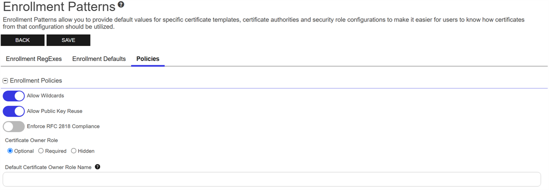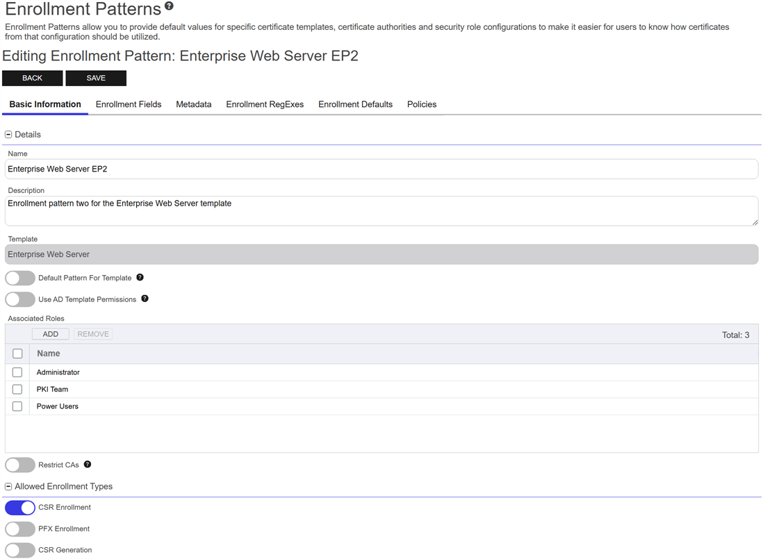 EnrollmentClosed Certificate enrollment refers to the process by which a user requests a digital certificate. The user must submit the request to a certificate authority (CA). patterns in Keyfactor Command provide a flexible way to streamline certificate enrollment by defining default values, policies, and access configurations for specific certificate templates and certificate authorities. This functionality helps reduce duplication of templates at the CAClosed A certificate authority (CA) is an entity that issues digital certificates. Within Keyfactor Command, a CA may be a Microsoft CA or a Keyfactor gateway to a cloud-based or remote CA. level while meeting diverse business requirements. On this page, you can manage enrollment patterns by adding, editing, and deleting them, configuring system-wide settings, and copying existing patterns to create new ones. These operations ensure enrollment processes are tailored to user groups, enforce security policies, and simplify certificate management.