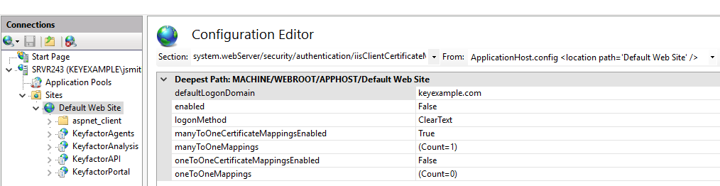 system.webServer/security/authentication/iisClientCertificateMappingAuthenticationImportant: Don't be tempted to configure this setting only at the application level (KeyfactorAgents) rather than at the Default Web Site level. It will only work if configured at the Default Web Site level and then enabled at the application level. -