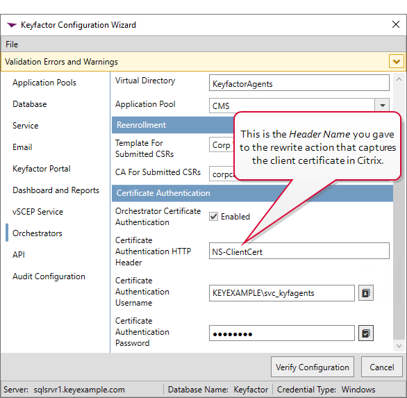 Once you have all the components configured on Citrix, you're ready to configure Keyfactor Command to enable client certificate authentication for the orchestrators. Once you do this, all orchestrators connecting to this instance of Keyfactor Command will be required to provide a certificate to authenticate. If you have some orchestrators deployed that do not support certificate authentication (e.g., Java agents), you will need to design a solution with multiple Keyfactor Command servers to support multiple authentication types. Contact your Keyfactor representative for assistance with this.