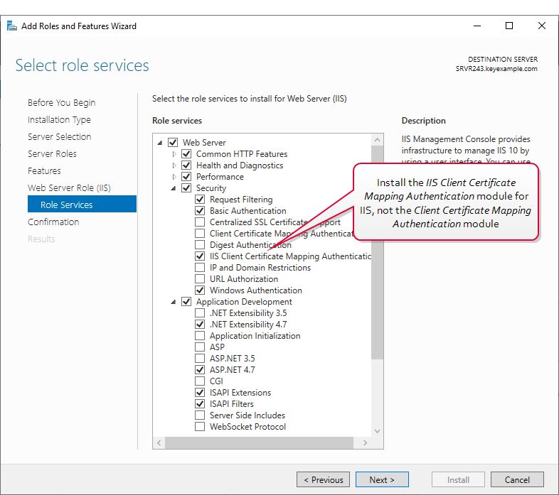 Tip: It's fine to install both IIS Client Certificate Mapping Authentication and Client Certificate Mapping Authentication, but the former is what's needed for this solution.