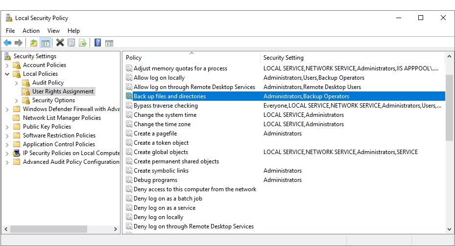 The user installing the orchestrator must have the SeBackupPrivilege and SeRestorePrivilege rights on the Keyfactor Universal Orchestrator server. Normally, administrators are granted these permissions by default, but you should confirm the permissions prior to starting the install. These permissions can be set through Group Policy or Local Security Policy, and can be found under Local Policies\User Rights Assignment as Back up files and directories and Restore files and directories.