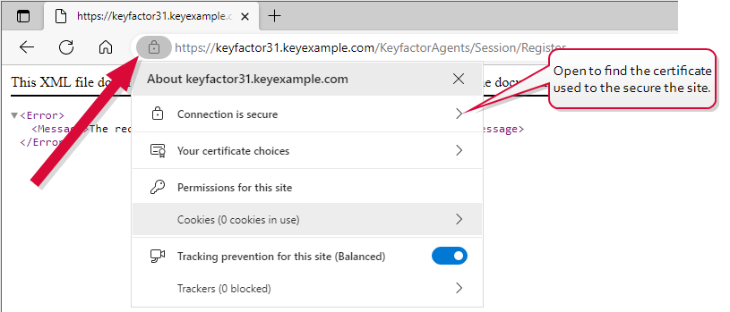 Visit the referenced URL (https://keyfactor.keyexample.com/KeyfactorAgents/Session/Register) in a browser on the orchestrator server. This should give you a response of: