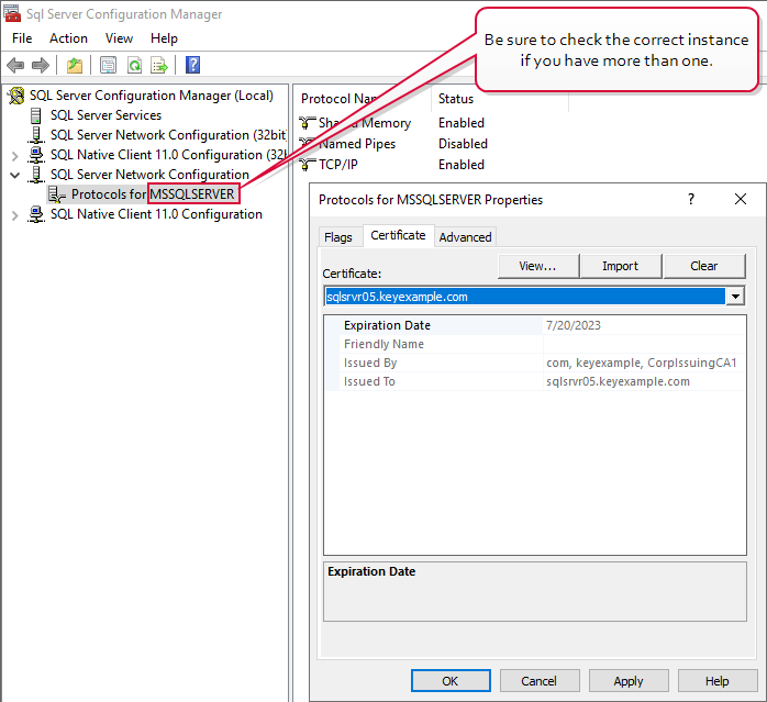 - Configure the SSL certificate in SQL using either the SQL Server Configuration Manager or registry as shown above for checking whether there is an existing certificate configured (see SQL Server Configuration Manager).
