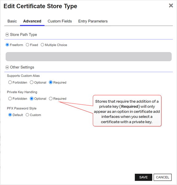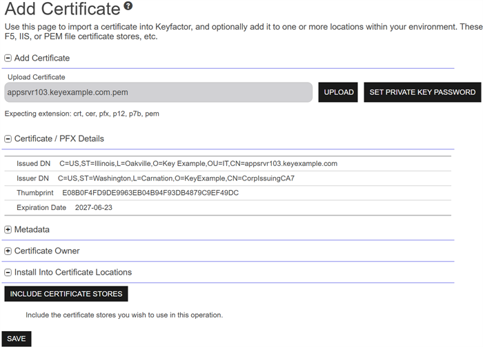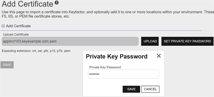 4. For a certificate with an encrypted private key, when prompted enter the password for the encrypted key and Save. This will open the Add Certificate page, which will allow you to change/add metadata and choose certificate locations to deploy the certificate to. Set Private Key Password allows you to reenter the password once you have uploaded the certificate.