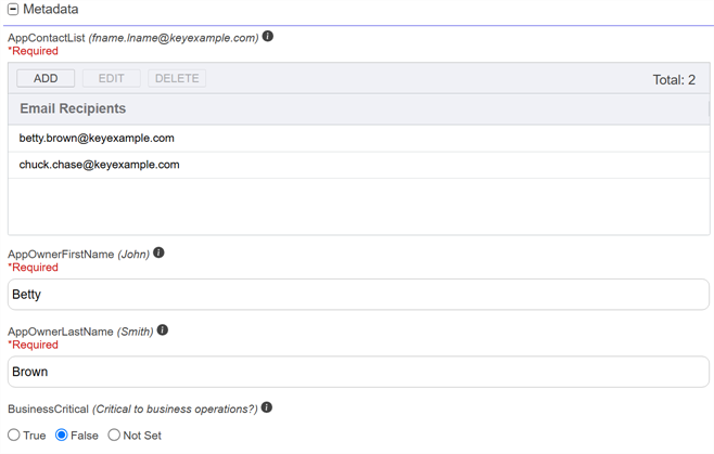 6. In the Metadata section of the page, populate any defined certificate metadata fields (see Certificate Metadata, Configuring Template Options, and Adding or Modifying an Enrollment Pattern) as appropriate. These fields may be required or optional depending on your metadata configuration. Required fields will be marked with *Required next to the field label. Any completed values will be associated with the certificate once it has been imported into Keyfactor Command. The order in which the metadata fields appear can be changed (see Sorting Metadata Fields).