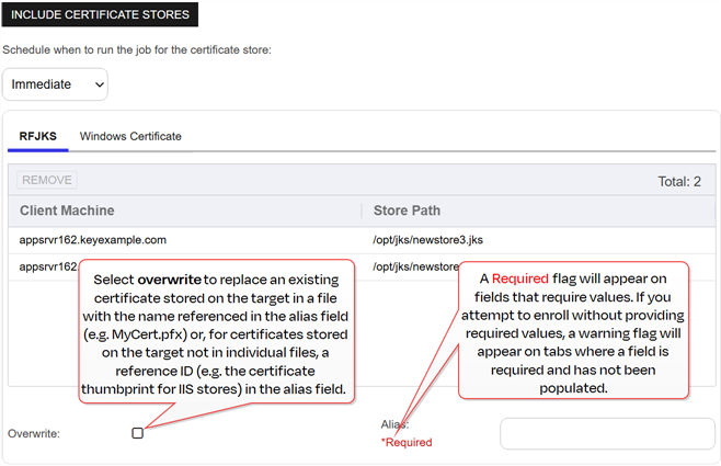 If an inventory job does not already exist for the certificate store, one will be added automatically to update Keyfactor Command with the changes to the certificate store. The inventory job will be configured to run either immediately or at the same exactly once time as the management job, depending on the configuration of the management job and then will be cleared.