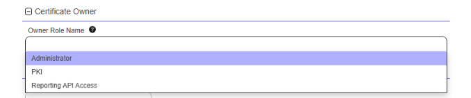 7. The Certificate Owner section of the page appears if you set the Certificate Owner Role policy to Optional or Required at either the system-wide or enrollment policy level (see Configuring System-Wide Settings and Enrollment Pattern: Policies Tab). The certificate owner refers to a security role (not the users, individually), as defined in Keyfactor Command (see Security Roles and Claims). The Owner Role Name is a search select dropdown. To narrow the list of results in a search select dropdown, begin typing in the input field. Matching results will appear as you type. The roles available to choose from will depend on the certificate security configuration for the user (see security roles and permissions for Certificates).