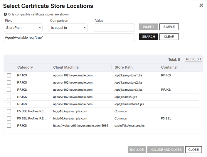8. In the Install into Certificate Locations section of the page, select each certificate store location to which you want to distribute the certificate, if desired. To do this, click the Include Certificate Stores button. This will cause the Select Certificate Store Locations dialog to appear. Make your certificate store selections in this dialog as described in Select Certificate Store Locations, below, and click Include and Close. You will then see some additional fields on the page. Populate these as per Add to Certificate Stores and Information Required for Certificate Stores, below.