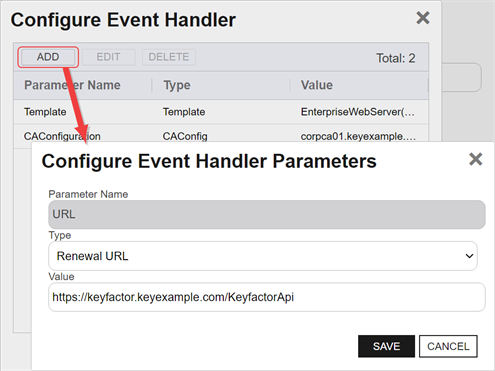 A parameter or argument is a value that is passed into a function in an application. dialog, select Renewal URL as the parameter Type, and enter the URL to the Keyfactor Command server hosting the Keyfactor API