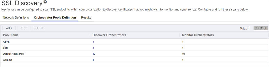Keyfactor orchestrators perform a variety of functions, including managing certificate stores and SSH key stores. pool, containing orchestrators with discovery and monitoring capabilities, to a network. An orchestrator pool contains one to many orchestrators that support the SSL discovery and monitoring capabilities. Network scanning using orchestrator pools allows the work to be dispersed among the orchestrators in the pool.