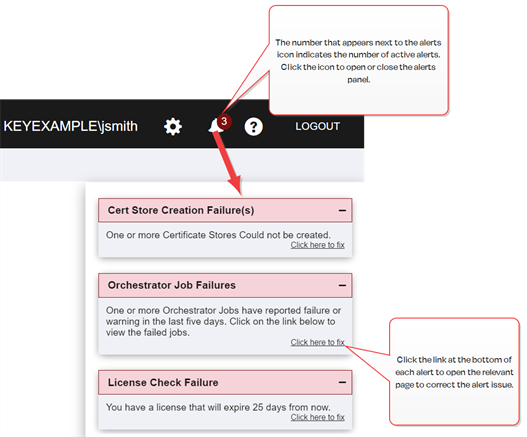 The System Alerts panel appears at the right of the Management Portal page to display any alerts found within Keyfactor Command. Click on the alerts icon to toggle the System Alerts panel open/close. Click on the link included at the bottom of the system alert to be taken to the relevant page in the Management Portal to make the required configuration changes or corrections, if applicable. Some examples of conditions for which the system alerts appear include:
