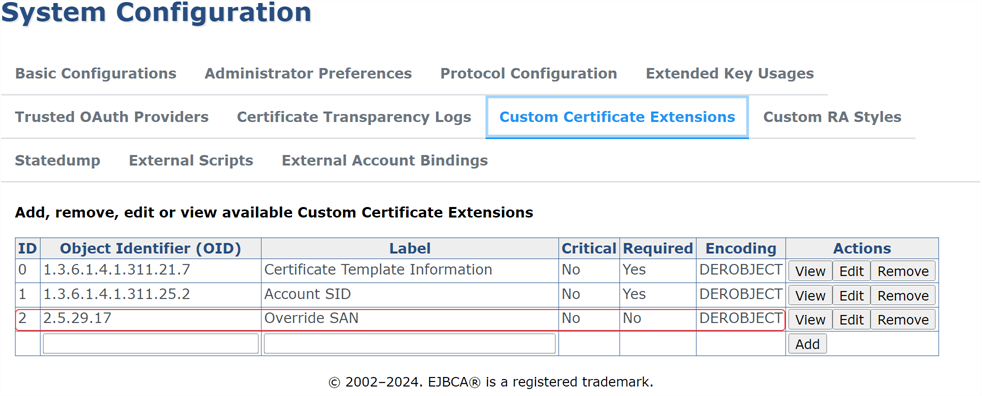 - In the EJBCA administration portal, browse to System Configuration > System Configuration > Custom Certificate Extensions.