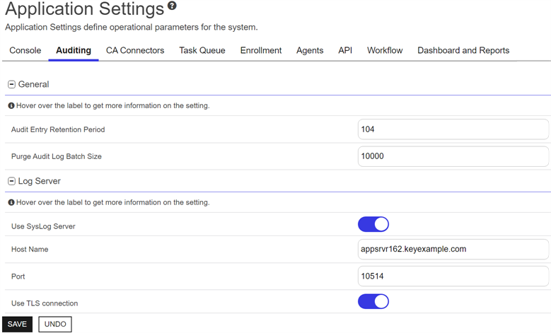 | Auditing | Log Server | Port | The port to connect to the centralized logging server. The default port (configurable during install) is 514. |