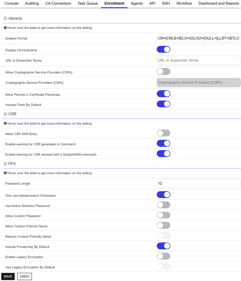 | Agents | General | Default ODKG Subject Input to Freeform | If toggled to On, on the On-Device Key Generation page, defaults the subject entry form to the Freeform format rather than the Strict format. The default is Off (Strict format). |