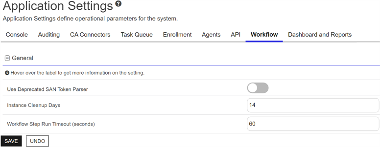 | Workflow General | General | Use Deprecated Sans Token Parser | The $(sans) token functions differently in workflow output depending on the configuration of this setting. When this application setting is toggled to On, the $(sans) token output is very similar to the $(sansformattedprint) token output, with the SANs in a cleanly formatted string. When this application setting is toggled to Off, the $(sans) token output is a serialized as a JSON string, which supports the use of ConvertFrom-Json -AsHashtable. The default is Off. |
