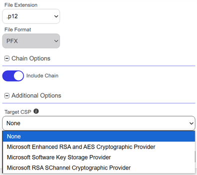 If toggled to On, enables the Use Legacy Encryption toggle on the PFX Enrollment and Certificate Search download dialog by default. If toggled to Off, disables the Use Legacy Encryption toggle by default. The default is Off. Note: This option is dependent on the Enable Legacy Encryption option and is grayed out unless Enable Legacy Encryption is enabled.